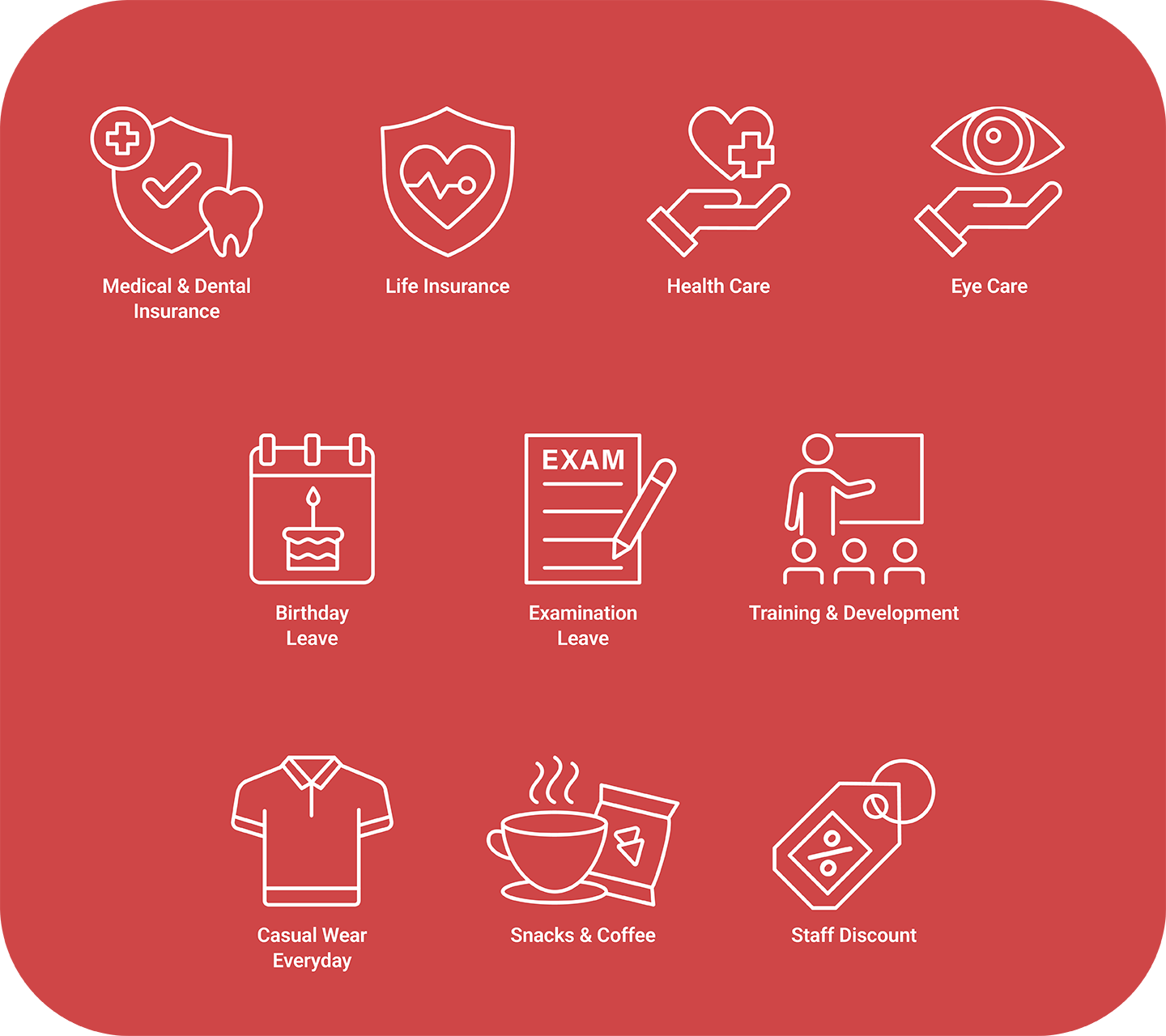We offer an attractive remuneration packages with a wide range of fringe benefits including medical, dental and life insurance, study sponsorship, and career prospects to the right candidates. We also offer on-the-job training and specialized training programs for employees to grow as professional and develop successful career.